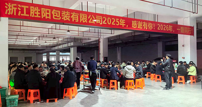 2026年1月30日,正值岁末年初,浙江胜阳包装有限公司的二楼厂区被装点得格外喜庆,洋溢着浓浓的年味与蓬勃的生机。“2025年,感谢有你!2026年,一路同行”——大红横幅上简短而温馨的话语,既是对过去一年辛勤付出的褒扬,也是对未来携手共进的期许,瞬间点燃了现场每一位员工心中的热情。