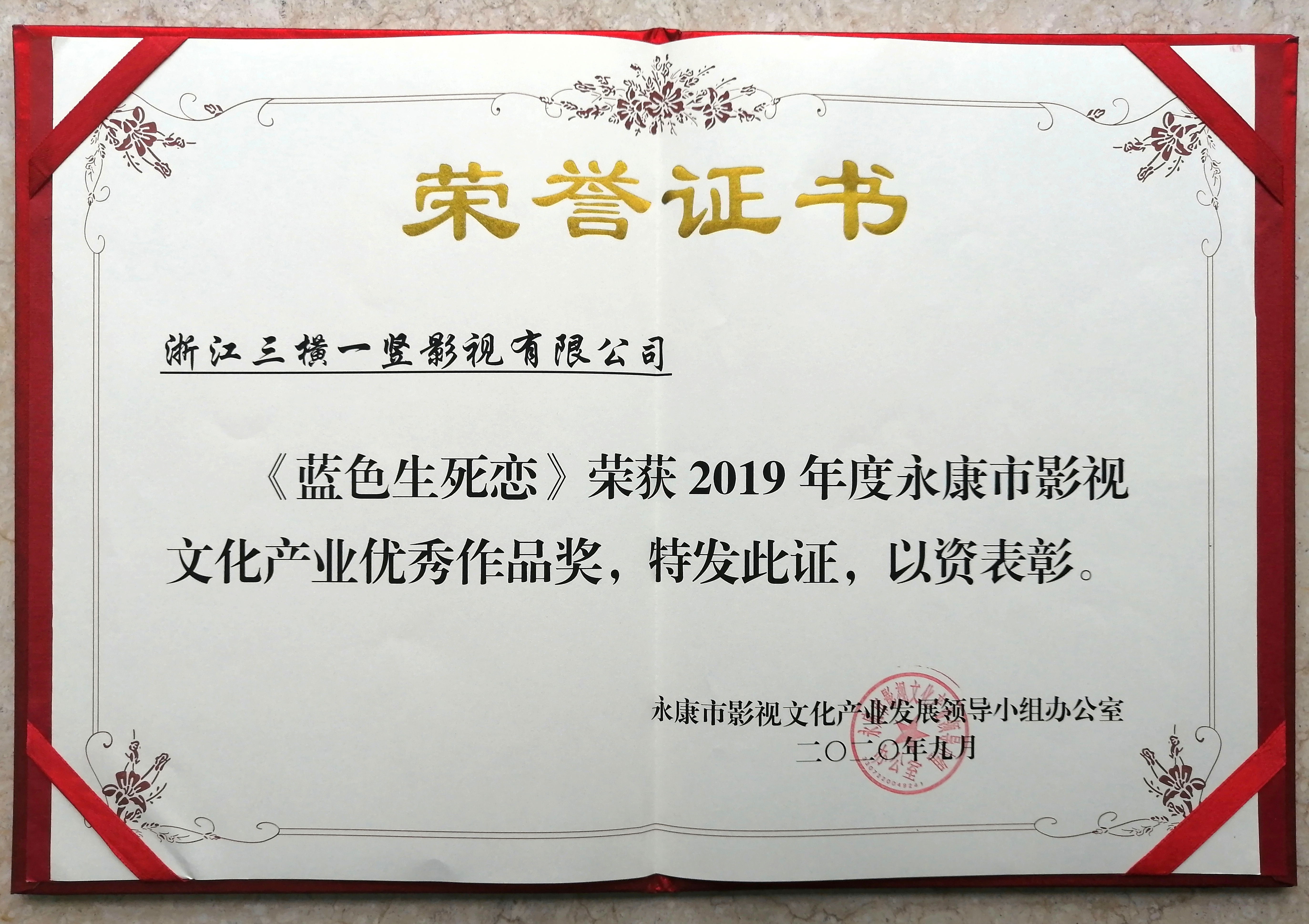大红的荣誉证书,晶莹而端庄的奖杯,上书:《蓝色生死恋》荣获2019年度永康市影视文化产业优秀作品奖,特发此证,以次表彰。